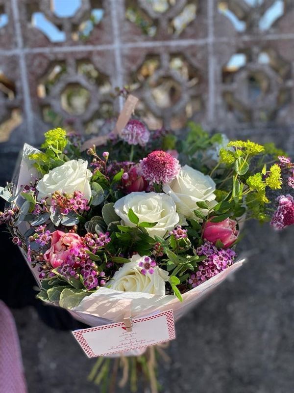 Arreglo floral Dulzura compuesto por una selección de flores en tonos rosas, lilas y blancos junto a verdes variados. Las variedades de flor cambiarán según disponibilidad.